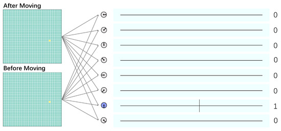Several computer simulations were performed to validate the proposed mechanism. We generated a dataset of images, each comprising 32 × 32 pixels. The light spots in these images are from 1 pixel to 32 pixels and move randomly in one of the following eight directions: (1) RIGHTWARD, (2) UPPER RIGHTWARD, (3) UPWARD, (4) UPPER LEFTWARD, (5) LEFTWARD, (6) LOWER LEFTWARD, (7) DOWNWARD, (8) LOWER LEFTWARD. The input to the simulation program comprises the following two states of the moving pattern: After-moving state (at time t) and before-moving state (at t − t).