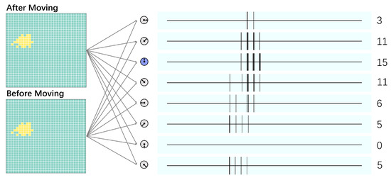 In the proposed inhibitory mechanism, each pixel of the image contains eight local motion-sensing direction-selective neurons. We extracted the information on local motion direction of every pixel, recorded the activities of these neurons, and inferred global motion direction from the local motion direction information. The direction corresponding to the most activated neuron is considered the direction of motion. Figure 5 shows an example of a 1-pixel pattern. The activities of the eight local motion-sensing direction-selective retinal ganglion neurons were recorded in the right part. The number on the far right represents the number of activations of neurons in each direction. The DOWNWARD neuron was activated 1 time, which was the highest among these neurons. Thus, we can concluded that 1 pixel pattern were displaced −1 unit along the y-direction (a DOWNWARD movement). The same results can be obtained for other multi-pixel patterns, including a randomly generated 32-pixel pattern. Figure 6 shows the 32-pixel pattern. The UPWARD neuron was activated 15 times, which is the highest among these neurons. Thus, the 32-pixel pattern can be considered as to displace 1 unit along the y-axis (an UPWARD movement). Figure 7 shows the measurements of the random-dot patterns. Two images of the patterns were used as shown above. In this example, 30% of light spots were selected randomly and displaced 1 unit along the x-direction. The yellow pixels were displaced −1 unit along the x-direction and 1 unit along the y-direction (an UPPER RIGHTWARD movement). The UPPER RIGHTWARD neuron was activated 76 times, which is the highest among these neurons. From these figures, we obtain 98.3% detection accuracy in our experiment. These findings indicated that the proposed mechanism can detect motion direction with high accuracy in a wide range of applications.