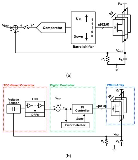 Figure 1 shows the circuit diagram for the baseline D-LDO and the proposed D-LDO. The baseline D-LDO employs a comparator and a barrel shifter, whose output code switches 1 bit in a clock cycle. In order to speed up the response, a TDC-Based Converter and an adaptive PI controller are used. The first component is the TDC-based Converter, which provides a digital code of the output voltage . In the TDC-based converter, a voltage sensor firstly converts the output voltage () to a time signal by capturing the charging time of a capacitor. The TDC includes the buffers and D-Flip-Flops, converting the time signal to a 63-bit width thermometer code furtherly. Then, the second component is the Digital Controller which consists of a subtractor, an error detector and a PI controller. The subtractor in the digital controller outputs the error between the thermometer code and the reference voltage . The error is transmitted to the PI controller and the error detector. Together with a code calculated by the error detector, the PI controller determined the number of turned-on transistors in the following PMOS array which contains 63 identical PMOS devices controlled by the digital code supplied currents. The proportion and integral coefficients of the PI controller are selected adaptively according to fuzzy rules based on the error and the integral of the error. In this way, the PI controller produces 63-bit width thermometer codes to control the gate of the power transistors in the PMOS array, so that the right amount of current is supplied to the load. The major building blocks of the proposed architecture above will be illustrated in Section 3.
