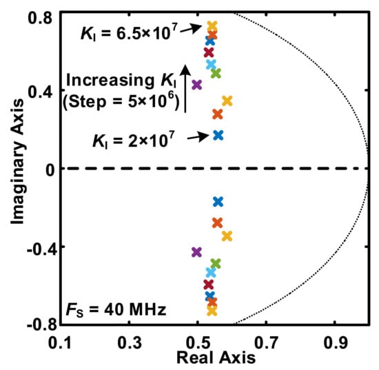 The pole plot of the proposed system under variable integration gain (x shown in Figure 3).
