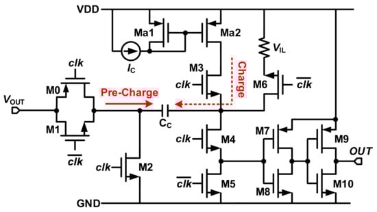 Figure 4 shows the schematics of the voltage sensor which converts the analog signals to time signals. The operation process of voltage sensor consists of two parts. Firstly, when is low level, the switches M0, M1, M5, and M6 are turned on. The capacitor is pre-charged with and which is the trigger voltage of the DFFs which is an information storage device with memory function and two stable states behind. During the charge stage, the quantity of electric charge in can be expressed as . Secondly when is high level, M3, M4, and M6 are turned on, the two plates of are connected with GND and current source . Because the current loss of does not occur suddenly, the charge variation in is given as follow