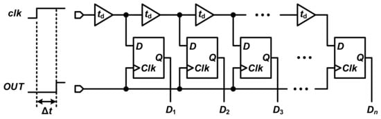 Figure 5 shows the schematics of the TDC. During the time of , the input signal “1” is transmitted in the delay line. When the pin generates a positive edge, in other words, the time is consumed, the DFFs are triggered. The number of DFFs output signal “1” is expressed as , where is the delay time of a buffer. The buffers and DFFs showed in Figure 5 are suitable for standard cell-based logic synthesis.