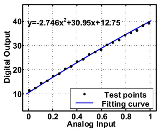 From the discuss above, an analog signal of is converted to a signal about time through the operation of voltage sensor when in low level. After is switched to high level, the time signal is transmitted to the TDC for generating digital codes. At the end of a cycle, 63-bit digital thermometer code is obtained. Figure 6 shows the linearity of the proposed TDC-based converter. The test points are fitted into a quadratic function. The different value of is converted to digital code and the a quantization interval of the TDC-based converter is about 25 mV.