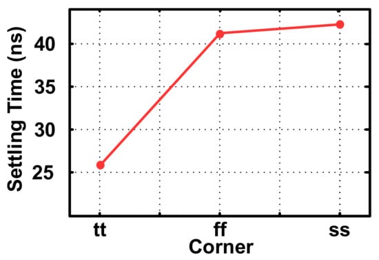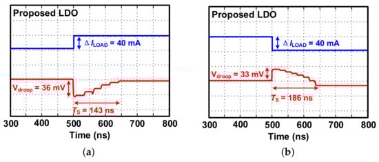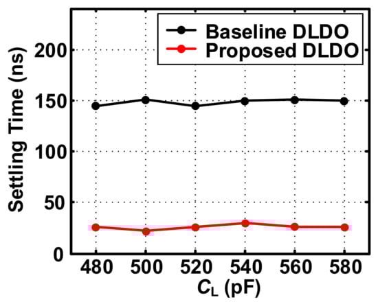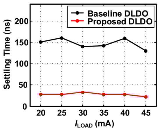 In order to describe the transient response speed of the proposed circuit, the settling time with variable load was simulated. The settling time is defined as the time that the output voltage recovers to 90% of the droop voltage. As shown in Figure 9 and Figure 10, the proposed D-LDO reduces the settling time under each condition. The settling time is decreased to only 17.6% of the baseline design of D-LDO (from 147.8 ns to 26.1 ns) on average in corner tt which means typical corner. In other words, the proposed circuit improves the response speed by about 5 times.