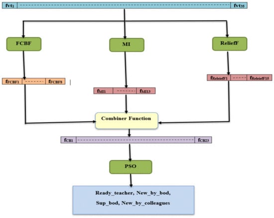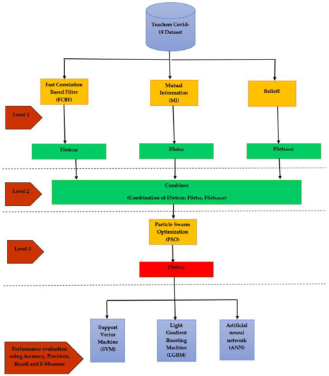 Pseudocode 1 explains the main working of the proposed approach, to identify the factors affecting the satisfaction of teachers on online learning during COVID-19. At the first level, the dataset is given as input to FCBF feature selection, MI feature selection, and Relieff feature selection. As a result, three feature sets are extracted named, FSetFCBF, FSetMI, and FSetRelieff with a different number of features. These three feature sets are then combined through the combiner function. The union of three sets is performed to combine the three feature sets. The combined feature set is named FSetCB. To get the optimal features, FSetCB is given as input to PSO feature selection, and hence final FSetFinal is retrieved at the end, Whereas SVM, LSBM, and ANN machine learning algorithms evaluate the performance of the proposed feature selection method.