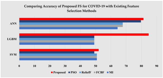 Figure 3 presents the comparative analysis of proposed feature selection in terms of accuracy on the COVID-19 teacher dataset with other existing feature selection methods like PSO, Relieff, FCBF, and MI. Equation (1) presents the formula for accuracy.
