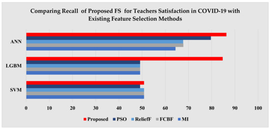 Similarly, for accuracy and precision, the recall results of the proposed work for identifying the factors affecting the satisfaction of teachers during COVID-19 online learning outperform existing feature selection techniques.