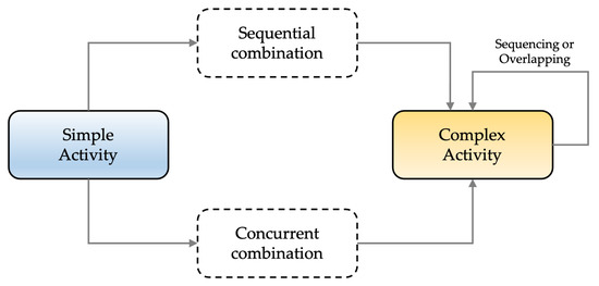 To address the problem of complex human recognition, we explored activity taxonomies [19,35,64] and classified human activity into two classes, simple and complex, using the SC taxonomy paradigm [35] as shown in Figure 2.
