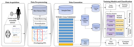 This section summarizes the entire configuration of the proposed S-HAR framework. Data acquisition, which includes data gathering from wrist-worn sensors, is the first step in the process. The next step is data pre-processing, which includes noise reduction, missing data filling, and data normalization. Data segmentation is also required in this procedure to convert multi-dimensional sensor data into sample data in suitable conditions for model training. This covers the definition of temporal windows, the overlap of temporal windows, and the class assignment and labeling. Following this, the sample data are separated into training and test data using the 10-fold cross validation approach in the data generation stage. DL model training with variations of DL models is the next step. Four RNN-based DL models (LSTM, BiLSTM, GRU, and BiGRU) and hybrid DL models are included in our proposed CNN-BiGRU model. Finally, performance evaluation criteria such as accuracy, precision, recall, F1-score, and confusion matrix are used to validate these models. As a result, a confusion matrix is used to compare the results of each DL model. Figure 3 shows the workflow for the proposed S-HAR framework.