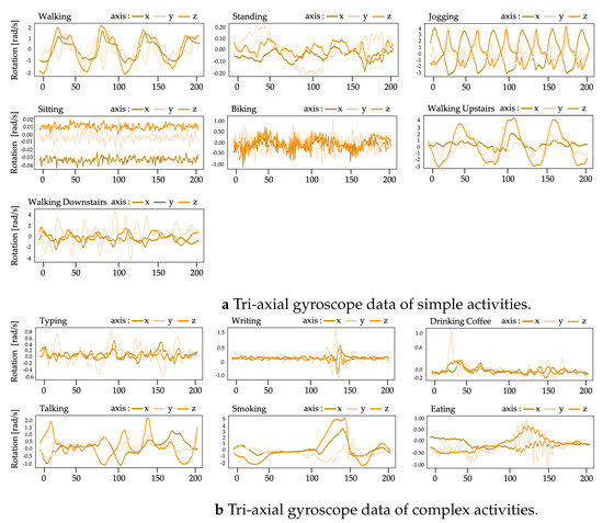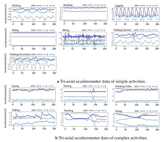 Figure 4 shows graphical plots of the tri-axial accelerometer data for seven activities categorized as simple, including “Walking”, “Standing”, “Jogging”, “Sitting”, “Biking”, “Walking Upstairs”, and “Walking Downstairs”. We can observe that most of the sensor data are repetitive and stable. The accelerometer data are distinguishable from the six activities categorized as complex, including “Typing”, “Writing”, “Drinking Coffee”, “Talking”, “Smoking”, and “Eating”, as shown in Figure 4b. As mentioned in Section 2, the complex activities are hand-related. The accelerometer data of complex activities can be perceived as being non-repetitive.