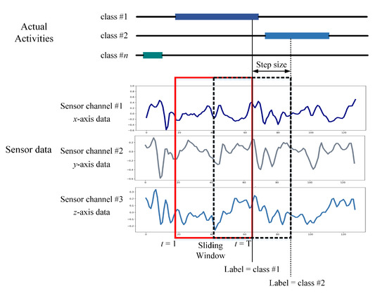 The next step of the proposed S-HAR is to create data samples from the raw sensor data. The raw data was segmented into small windows of the same size, known as temporal windows, in this method. Before training a DL model, raw time-series data recorded from wrist-worn wearable sensors are split into temporal segments. The sliding approach is frequently used and has been demonstrated to be useful for handling flowing data. Figure 6 depicts a data segmentation scheme with an example of sensor data segmentation, where X, Y, and Z represent the three components of a tri-axial wrist-worn sensor. All time intervals are the same as t, defined as the window size. The refers to the reading of X, Y, and Z in the period [t, t]. The method is known as an overlapped temporal window and involves applying a fixed-size window to the sensor data sequence to generate data samples. With a 50% overlap proportion, the OW scheme is commonly utilized in S-HAR research [24]. In the proposed S-HAR, the wrist-worn data were segmented with window sizes of 5, 10, 20, 30, and 40 s with the overlapping of 50% in this process.