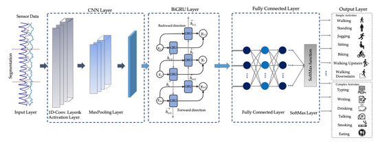 The input for the proposed DL model is the time-series in a time window of size T from N sensors. Let the input time series be X = {, , ,…, , ,…} where is the input at time point t. It consists of three sub-modules: (1) an embedding layer consisting of multiple one-dimensional convolutional layers to learn locally spatial features from the inputs of wearable sensors; (2) an encoder consisting of one or more bidirectional gated recurrent unit (BiGRU) layers to extract long temporal features from the abstract information in the preceding CNN layer; and (3) a fully connected module composed of hidden layers of a deep neural network. Each hidden layer is composed of neural nodes which relate to the neural nodes of the previous layer. We add a SoftMax classification layer on top of these sub-modules.