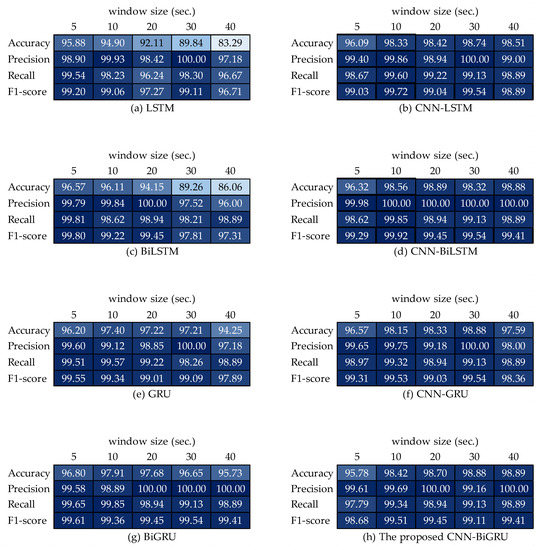 We present the experimental setup and results used to investigate four baseline DL models (LSTM, BiLSTM, GRU, and BiGRU) and hybrid DL models, including the proposed CNN-BiGRU for sensor-based HAR in this section. All hyperparameter settings of these models are shown in Appendix A.