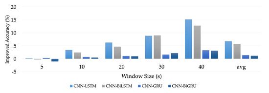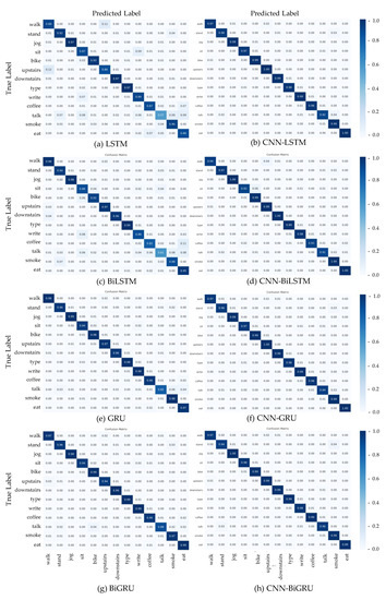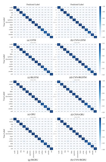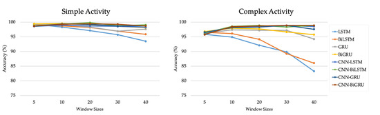 The recognition performance of the proposed CNN-BiGRU model for complex human activity recognition is evaluated in this section. We divided activity data of the UTwente dataset into three categories: all activity, complex activity, and simple activity. Four RNN baseline models and hybrid DL models were separately applied to each category by using the 10-fold cross validation protocol.