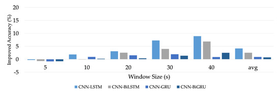 Many DL models, such as InceptionTime [29], temporal transformer networks [61], and LSTM-FCNs [62], have been presented in the last year to solve specialized problems in time-series categorization. In an HAR study, InceptionTime outperformed ResNets and CNNs by using a real-world dataset to classify transportation-related behaviors using inertial sensor data from a smartphone [61]. In [63], a modified InceptionTime model called Inception-ResNet was presented to perform on the HAR challenge and achieve meaningful results. The InceptionTime model, on the other hand, necessitates a significant amount of training data and a large number of hyperparameter optimizations. This work stands out from earlier research in that it proposes a unified DL strategy for recognizing complicated activities. Human activity aspects that are complex are typical of people’s daily lives and are more difficult to recognize. For designing wearable applications for real-time S-HAR, it is important to recognize CHAs. The motivation for the proposed model is to improve the recognition performance of the existing HAR model and to analyze the impacts of various aspects in the recognition of complex activities according to considerable variability in human motions. To our knowledge, this is the first study to show the impact of several learning parameters on DL techniques, such as sliding window sizes, convolution layer combinations, and the bidirectional methodology. This study reports extensive studies to compare the recognition performance of the four baseline DL models with our suggested hybrid DL models, named CNN-BiGRUs, in various learning settings in order to achieve the purpose of our research.