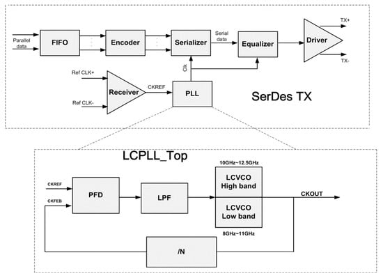 Block diagram of the Serdes transmitter (TX) and the inductance capacitance (LC) phase-locked loop (PLL) structure. FIFO: first-in first-out; PFD: phase and frequency detector; LPF: low pass filter.
