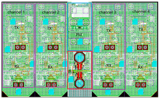Figure 6 shows the four-channel SerDes system layout using the LC PLL of the proposed design. The red rectangular region is the LC PLL. The blue rectangular region is the power management (PM) circuit. The four purple rectangular regions are the four channels of the SerDes TX and RX. The LC PLL is based on the UMC 28-nm 1P10M CMOS technology, and the LC PLL area is .
