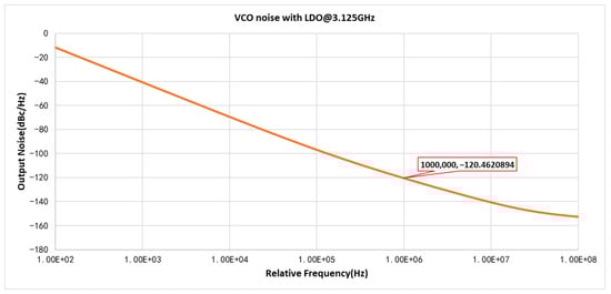 Figure 7 shows the post-simulation result of the total output phase noise of the LC VCO designed in this study. It should be noted that to correspond to the test circuit, during the simulation, the output frequency of the VCO should be 3.125 GHz after passing through a divide-by-four circuit (the frequency is reduced four times). The phase noise simulation result includes the influence of the VCO’s device and LDO output noises.