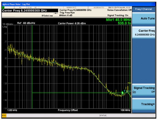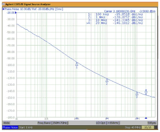 Figure 8 shows the LC VCO output phase noise test results in the open-loop condition. The LC VCO output frequency is passed through the divide-by-four test circuit, and the noise spectrum of LC VCO is free run at 3.18 GHz, measured using E5052B, which is a signal source phase noise analyzer manufactured by Agilent (Agilent Technologies Inc., Santa Clara, CA, USA).