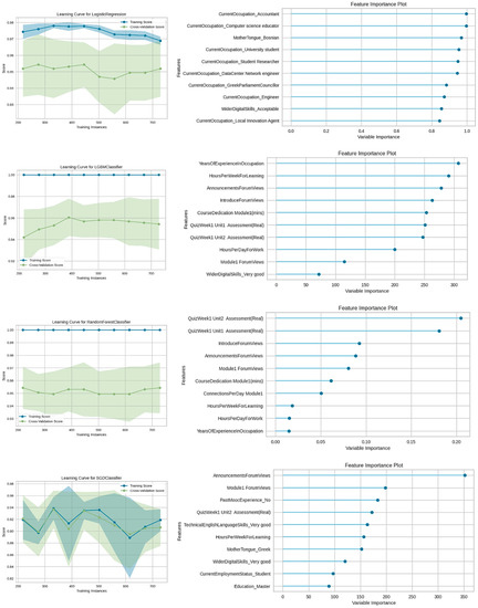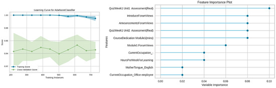 Figure 6 illustrates the learning curve for each classification model along with the most important features for making a prediction. Additionally, the relative importance score for each attribute is recorded in descending order. The most important attributes are “Quiz Week1 Unit1 Assessment”, “Quiz Week1 Unit2 Assessment”, “Announcements Forum Views”, and “Introduce Forum Views”. Finally, it is seen that all models achieve high accuracy using only 100 instances during the training phase.