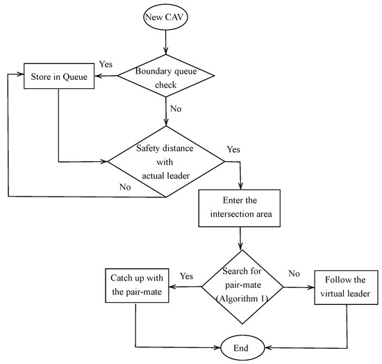 Figure 2 presents a flowchart that summarizes the proposed methodology’s implementation on every CAV and illustrates the resulted procedure for positioning in the virtual platoon. Based on the corresponding traffic demand scenario, new CAVs are generated and assigned to the approaching intersection’s legs in every time step. The newly generated CAV will be stored in a queue if there already exists a boundary queue in the relevant approaching leg. Before the CAV can enter the intersection area, it needs to obtain the safety distance (3) with its heading vehicle, the so-called actual leader. This prerequisite is designed to ensure the feasibility of initial conditions. If the CAV does not meet this prerequisite, independently of whether it has already been in the queue or not, it is required to wait in the boundary queue. As already explained, as soon as the CAV enters the intersection area, it is positioned in the virtual platoon. Thanks to Algorithm 1, the recently joined CAV searches for a pair-mate that fulfills the pairing criteria within the pairing region. If the CAV succeeds in finding a pair-mate, it commences forming the pair and catching up with its pair-mate. Otherwise, it follows the virtual leader with a safety distance.
