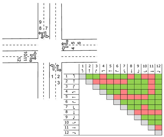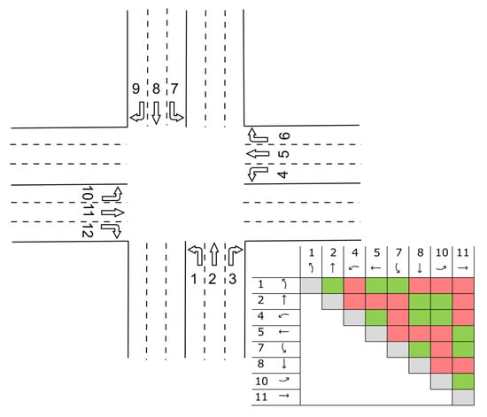 Intersection layout for case study I; non-conflict (green) and conflict (red) sets of movements.