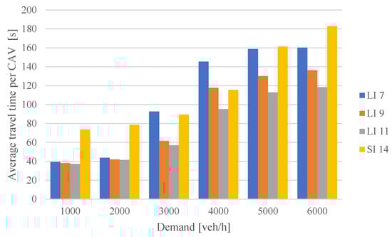 Both above scenarios are tested with low, medium, and high demands, i.e., veh/h. In this case study, the simulation time is 4000 s. As the generation of CAVs is performed by sampling from a Poisson distribution, the simulation framework is stochastic. Consequently, for every case 10 simulation repetitions are performed. Figure 5 presents the Average Travel Time (ATT) per CAV for the scenarios of Lightless Intersection (LI) and Signalized Intersection (SI). As demonstrated by the figure’s bars, for low demand, i.e., veh/h, and high demand, i.e., veh/h, LI always achieves better performance for CAVs than the SI scenario. However, for the medium demand, i.e., veh/h, SI scenario may have better performance if the assigned for the LI case is not sufficiently high (i.e., 11 m/s). Finally, it is worth noting that the LI scenario with m/s outperforms all other scenarios for the entire investigated demand spectrum.