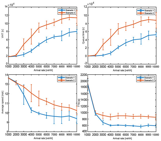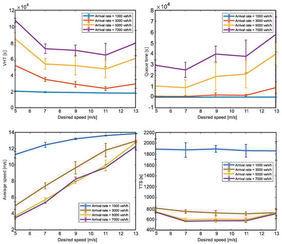 Again, we apply the lightless strategy for CAVs movement in this case study’s intersection region. To perform the sensitivity analysis, we utilize the following performance metrics: Vehicle Hours Travelled (VHT), Queue Time, Average Speed, and Total Time Spent (TTS). Since we introduce stochasticity in the simulation (CAV generation), we execute the simulation five times for every assigned demand value. Thereby, it is possible to study the average and standard deviation of all performance metrics. This way, the experiments provide more reasonable insights about a realistic performance of the applied strategy. Again, we apply the same parameters values presented in Table 1. In addition, we consider m/s for the lightless methodology.