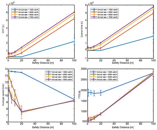 According to Equation (3), safety distance is the minimum distance required to be maintained between CAVs. Increasing safety distance increases the IDM distance. Consequently, the queuing time at the boundary of the system increases. As shown in Figure 9, all studied metrics demonstrate the best performance when the lowest safety distance is applied; this is a reasonable result as lower distances increase the system’s throughput.