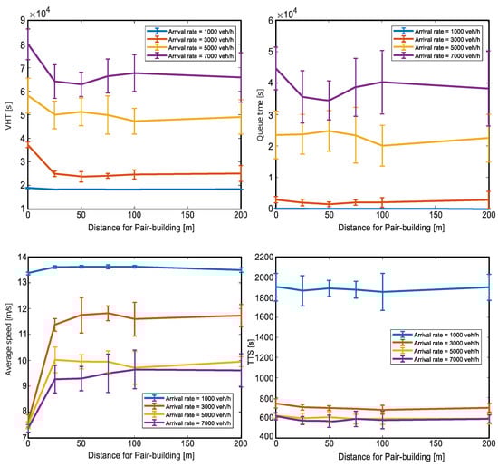 A short pairing region decreases the probability of finding pair-mates and, consequently, the number of pairs; this can result in lower throughput for the intersection. By analyzing the results of Figure 10, we observe that the lowest performance (maximum VHT, queuing time, TTS, and minimum average speed) is obtained for the pairing region of zero (i.e., no pairing is possible). On the other hand, considering a long catch-up distance may result in pairing two vehicles that are relatively far from each other. This phenomenon forces other CAVs located between these pair-mates in the virtual platoon to slow down, and consequently, a shock wave is created; moreover, note that this phenomenon is more likely to occur with lower demand rates. In Figure 10, we can observe the negative effects of these phenomena in terms of simulation average speed. The average speed drops slightly for low and medium demand rates when the pairing distance is set to a value larger than 75 m.