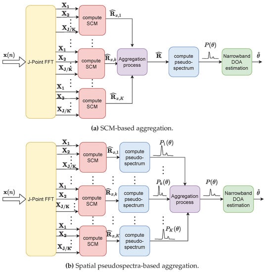 The aggregate SCM from (8) is then used to compute the spatial pseudospectrum using (7). The resulting spatial pseudospectrum is finally used to compute the DOA estimates. This process is similar to coherent aggregation but does not require focusing matrices to align the SCMs onto a reference frequency. SCM-based aggregation is therefore an incoherent technique with lower computational complexity compared to the coherent techniques.