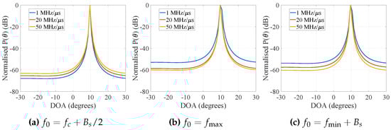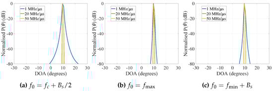 At the carrier frequency, the fractional bandwidths are small (Table 2). The LFM signals at each frequency bin are relatively close to the carrier frequency. In other words, the steering vectors associated with the bins containing the LFM signals of interest are very similar to the steering vector calculated at the carrier frequency. It must be noted that in the incoherent SCM-based aggregation method, after all the SCMs are combined, the pseudo spectrum is calculated using a single steering vector corresponding to the centre frequency. The slight performance deterioration as the chirp rate increases observed in Figure 2b can be attributed to the incoherence caused by the gradual deviation from the single steering vector assumption as the signal spreads over a wider bandwidth as discussed in Section 4.2.1. On the other hand, at the carrier frequency, the fractional bandwidths are much larger (Table 2).