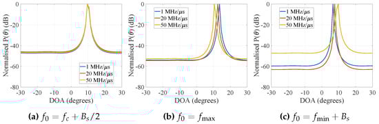 The LFM signals are therefore non-coherent with respect to the carrier frequency. For low chirp rates, the frequency deviations of the frequency bins that contain signals are large and lead to large phase deviations from the steering vector, which is calculated at the centre frequency. These large phase deviations lead to performance degradation. This is exacerbated by addition of noise in the aggregation of SCMs from bins that do not contain a signal component. For signals with high chirp rates, the number of bins that contain the LFM signal increases. The spread of the phase deviations caused by the frequency bins that are not well-aligned to the carrier frequency average around zero and lead to improved DOA estimation performance (see Figure 3b). In spatial pseudospectra-based aggregation, the individual pseudospectra are calculated using the SCM and steering vector calculated for the corresponding frequency bin. Thus, the effect of coherence is not as severe because aggregation is performed in the spatial domain (Figure 4b and Figure 5b). As the number of bins containing the signal increases, the DOA estimation improves. This is because the steering vectors for more frequency bins that contain the signal combine coherently, leading to improved estimation performance.