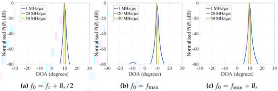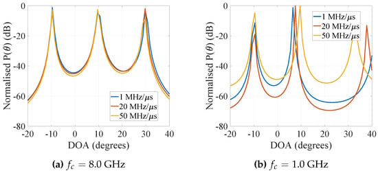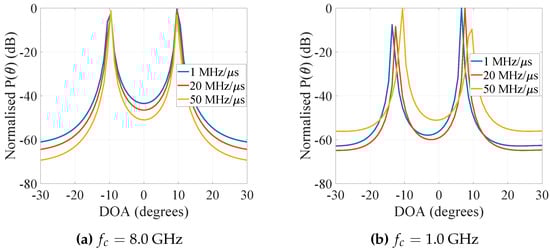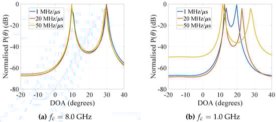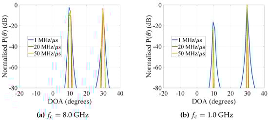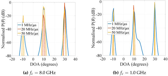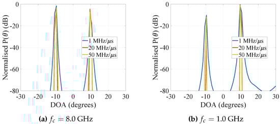 Figure 10 and Figure 11 show plots of the spatial pseudospectra against DOA for emitters that are situated at and for SCM-based and pseudospectra-based aggregation, respectively. Results for both and carrier frequencies are shown in each of these figures. For SCM-based aggregation, the peaks corresponding to the two emitters are clearly distinguishable at for all chirp rates considered. At , however, only the s signal shows peaks located at the true DOA values. The peaks for the s and s signals show significant deviations from the true DOA values.