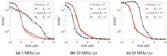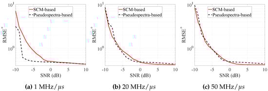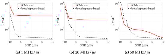 The performance for the emitter at is significantly better compared to that for the emitter at for all chirp rates. The first emitter at with initial frequency of is far away from the carrier frequency and shows performance similar to that observed in Figure 6 and Figure 7. The second emitter at with initial frequency of is centred around the carrier frequency and results in better estimation performance because the steering vector for SCM-based aggregation coincides with the carrier frequency, as explained in Section 4.2.1. With pseudospectra-based aggregation, the DOA estimation performance for both emitters is similar and improves as the chirp rate increases from s to s for SNR values above . However, this DOA estimation performance shows negligible variation as the chirp rate increases from s to s. The DOA estimation performance for pseudospectra-based aggregation improves as the carrier frequency changes from to .