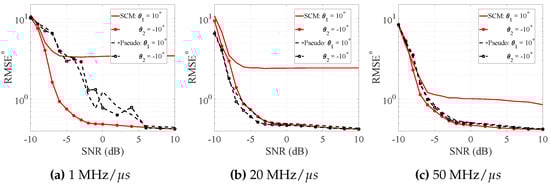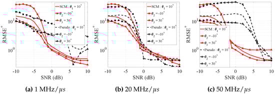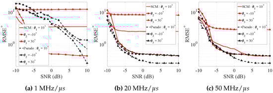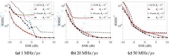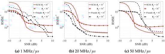 Variation in RMSE with SNR with different chirp rates for two signals at degrees, , with initial frequencies and .