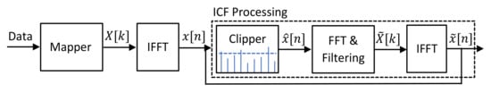 The ICF algorithm is outlined in Figure 1. The signal amplitude is kept below a preconfigured limiting threshold by repeatedly clipping amplitudes exceeding the threshold and filtering the resulting OoB radiations. The process therefore zigzags back and forth between time and frequency domain representations through the iterative computation of IFFT and FFT operations for a preset number of times, L. Fortunately, amplitude regrowth decays with the increasing number of iterations, thereby enabling the technique to effectively reduce the PAPR level as more iterations are applied.