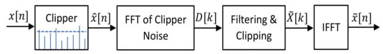 To address the PAPR issue, many classical solutions have been proposed over the years, including partial transmit sequence (PTS) [1], tone reservation (TR) [2], companding [3], selected mapping (SLM) [4], and clipping and filtering (CF) techniques [5,6,7,8,9,10,11]. CF is a simple but powerful approach that does not generally require the use of additional resource blocks or the transmission of side information, which make it of particular interest in the literature. In CF, the time-domain OFDM signal amplitude is limited to a predefined threshold level to keep the resulting PAPR within acceptable ranges. However, clipping the signal amplitude causes OoB power leakage which may not be tolerable by adjacent channels. The signal is therefore filtered to eliminate the OoB emissions. Nonetheless, filtering is invariably coupled with amplitude regrowth of the time-domain OFDM signal and this in turn increases the PAPR beyond the acceptable threshold. Consequently, iterative-based clipping and filtering (ICF) operation is needed to repeatedly clip the signal amplitude and filter the leaked emissions. However, ICF techniques are computationally expensive in general, especially when the number of sub-carriers is large. Simplified clipping and filtering (SCF) was introduced to achieve similar PAPR reduction performance in a single iteration of modified processing at a relatively cheaper cost. However, the required computational complexity is still high even for SCF.