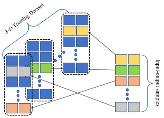 A 3-D training dataset, , is formed by running Algorithm 1. Initially, is propagated by zeros. The dataset, , is comprised of multiple 2-D slices as shown in Figure 4. The i-th 2-D slice, , is filled with a random selection of a group of time-domain samples. The samples are obtained by generating a vector of samples of an original OFDM symbol, , which is then fed to an ICF-based clipping algorithm to generate the corresponding output training vector, . SCF-based training can be applied alternatively. The samples of the two generated vectors are jointly scattered across the slices in a random fashion as shown in Figure 4. The process is repeated until all the slices within are filled with the training data.