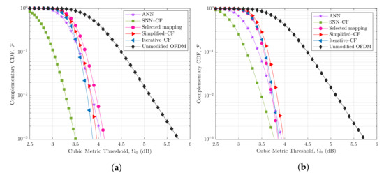 For QPSK-OFDM signals, the CM reduction performance was investigated for original unmodified OFDM, SLM, SCF, ICF, ANN, and the proposed SNN-CF schemes in terms of the complementary cumulative distribution function, , for different cubic metric threshold () levels ranging from 2.5 to 6 dB as shown in Figure 6a. The proposed SNN-CF scheme outperforms the best of the three conventional approaches and shows more than a 0.5 dB performance improvement compared to ANN at CCDF levels as low as . Similarly, Figure 6b shows that the proposed SNN-CF scheme maintains its superior CM reduction performance for the higher order 16-QAM-OFDM case. This is accomplished by scanning the neighborhood of SCF during the training stage to find an SNN-CF network with the highest possible performance.