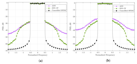 Figure 10 shows an alternative view on OoB power leakage of ANN and the proposed SNN-CF for QPSK and 16-QAM. The normalized out-of-band leakage power (NOLP) is defined as