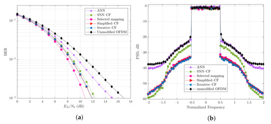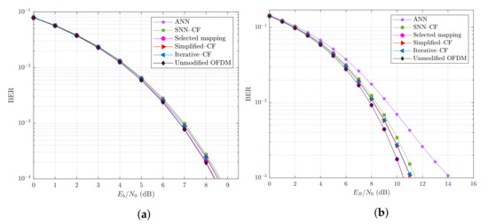 Figure 9a plots the BER performance of the proposed SNN-CF scheme vs. ANN, SLM, SCF, ICF, and raw OFDM signals for 16-QAM-based OFDM transmissions deploying a non-linear solid state HPA with the signal envelope amplitude, E, undergoing an amplitude-to-amplitude (AM/AM) conversion accomplished by the transfer function [22]: