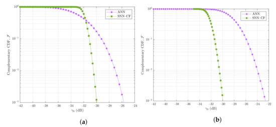 where is the total leaked power and is the power residing within the in-band. Lower NOLP levels are desirable for superior power leakage performance. Therefore, we use the complementary CDF on different threshold values of the NOLP: . The threshold level is varied within the ranges [−42,−24] dB and [−42,−22] dB for QPSK and 16-QAM, respectively, in order to capture the OoB leakage performance from CCDF unity level (corresponding to uncrossable threshold points) to levels as low as (corresponding to crossable threshold points with 99.9% success rate). As shown in Figure 10a, the proposed SNN-CF scheme generally outperforms ANN in terms of the reduction achieved on NOLP for QPSK modulation with a performance gap of about 4.25 dB at CCDF level of . In addition, for the 16-QAM case, the proposed SNN-CF scheme exhibits a much more controlled power leakage than ANN does with an approximately 7.25 dB performance gap at the CCDF mark, as shown in Figure 10b. This superior performance of SNN-CF compared to ANN is the result of the more accurate peak-tracking of SCF signals, as modeled by the non-linear SNN-CF mapper.