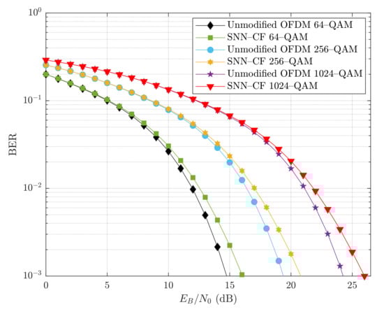 Figure 11 investigates the BER performance of the proposed SNN-CF scheme for higher order QAM modulations. For all three cases of 64-QAM, 256-QAM, and 1024-QAM transmissions, the proposed SNN-CF scheme successfully remains within close performance to original OFDM. For example, the performance gap for 64-QAM-based operation is about 1.25 dB at a BER level of . Similarly, for the 256-QAM and 1024-QAM cases, the performance gaps at the same BER level are about 1.5 and 1.75 dB, respectively. To attain even narrower gaps for higher modulation orders, the underlying neural network module can be expanded by slightly increasing the neurons within the layers, for example, to maintain the complexity within reasonable bounds.