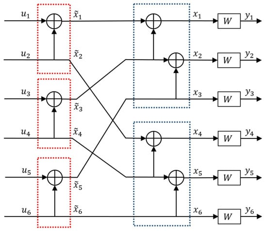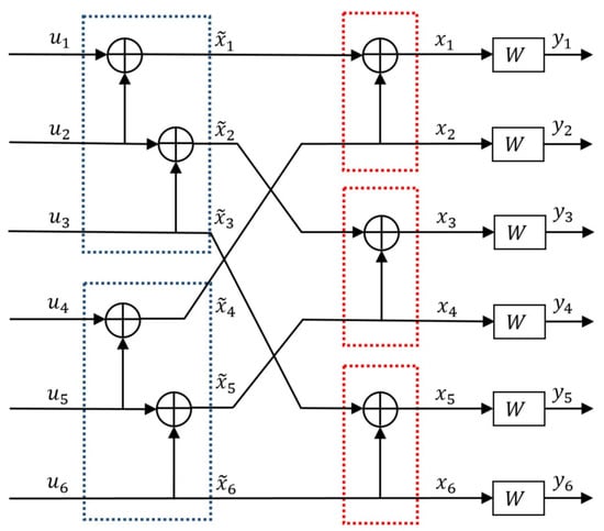 The circuit design for (where perm denotes the permutation of rows of G to establish the correct connection between stages of polarization; perm = bit-reversal for ) is shown in Figure 1, with the dashed red and blue boxes encapsulating the and polarization circuits, respectively.
