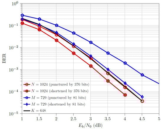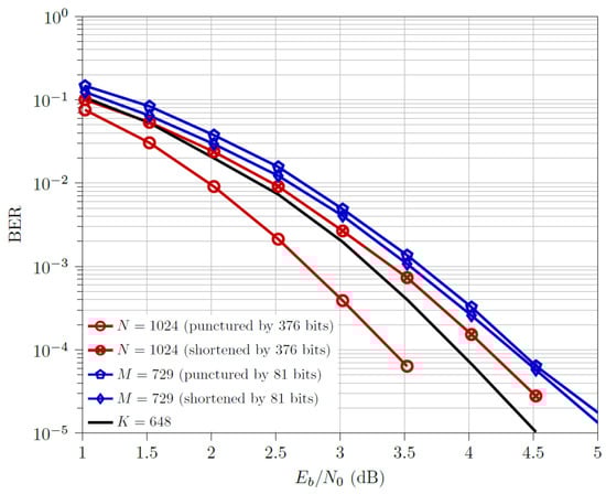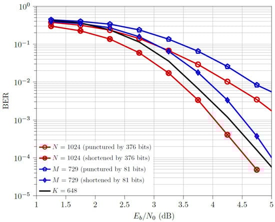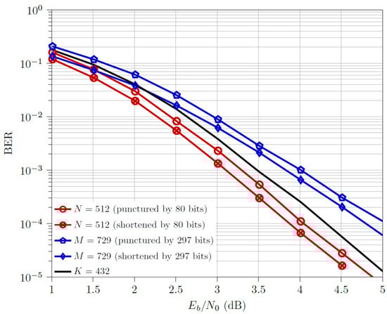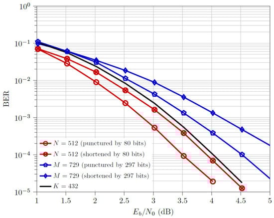 - For the half code rate, , shortened and codewords outperform the respective punctured ones. The multi-kernel codewords outperform both the downsized codewords but are outperformed by both the downsized codewords, with a performance gap of ≈0.5 dB from the optimal design (i.e., shortened codewords).