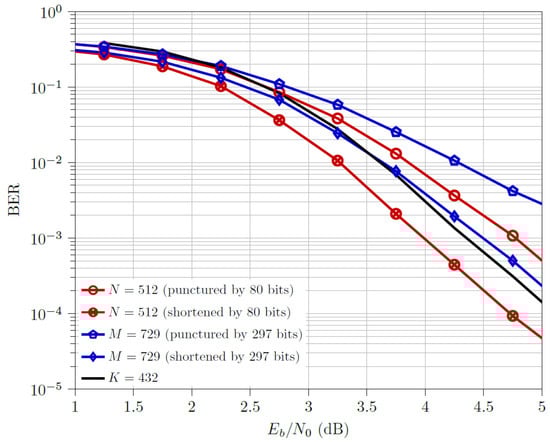 - For the high code rate, , shortened and codewords outperform the respective punctured ones. The multi-kernel codewords outperform all but the shortened codewords, with a ≈0.3 dB difference.