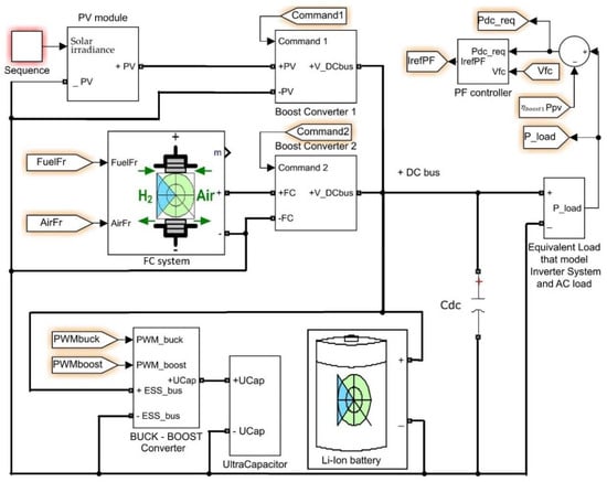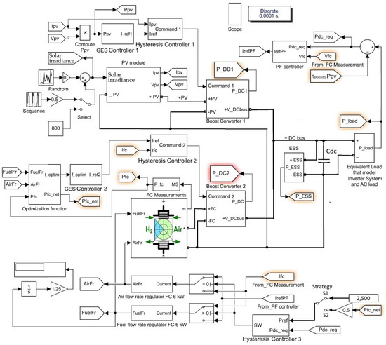 Figure 2. PV/FC/ESS hybrid power system diagram using strategies S1 and S2.