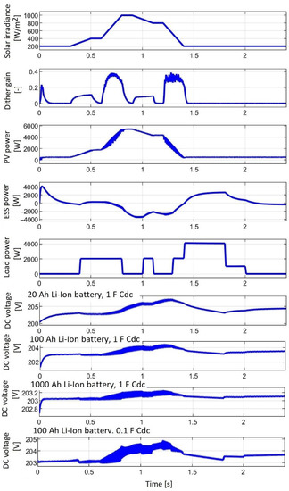 Figure 6. PV/ESS system under variable solar irradiance profile with slow slopes and random pulses of maximum 200 W/m2 added.