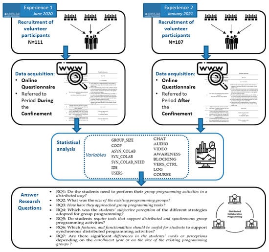 In this section, we describe the design of the cross-sectional pilot study aimed at finding out how the COVID-19 pandemic has led to the emergence of new needs in CS students when performing group programming tasks and the solutions adopted. The study, summarized in Figure 1 was conducted based on two experiences carried out at two different moments: the first one was performed in June 2020, immediately after the confinement decreed by the state of emergency in Spain (from March to May 2020), coinciding with the end of the second semester of the academic year 2019/2020; and the second one was conducted in January 2021, at the end of the first semester of the academic year 2020/2021.